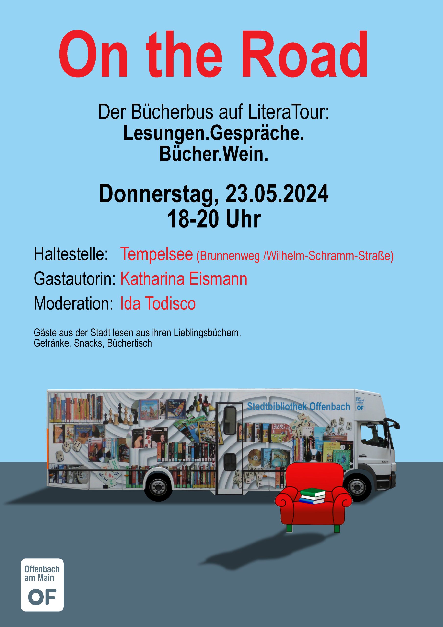 LiteraTour im Bücherbus mit Sigrid Katharina Eismann am Donnerstag, 23. Mai 2024. Treffpunkt: Haltestelle Brunnenweg/Wilhelm-Schramm-Straße, Offenbach-Tempelsee. Beginn um 18 Uhr.