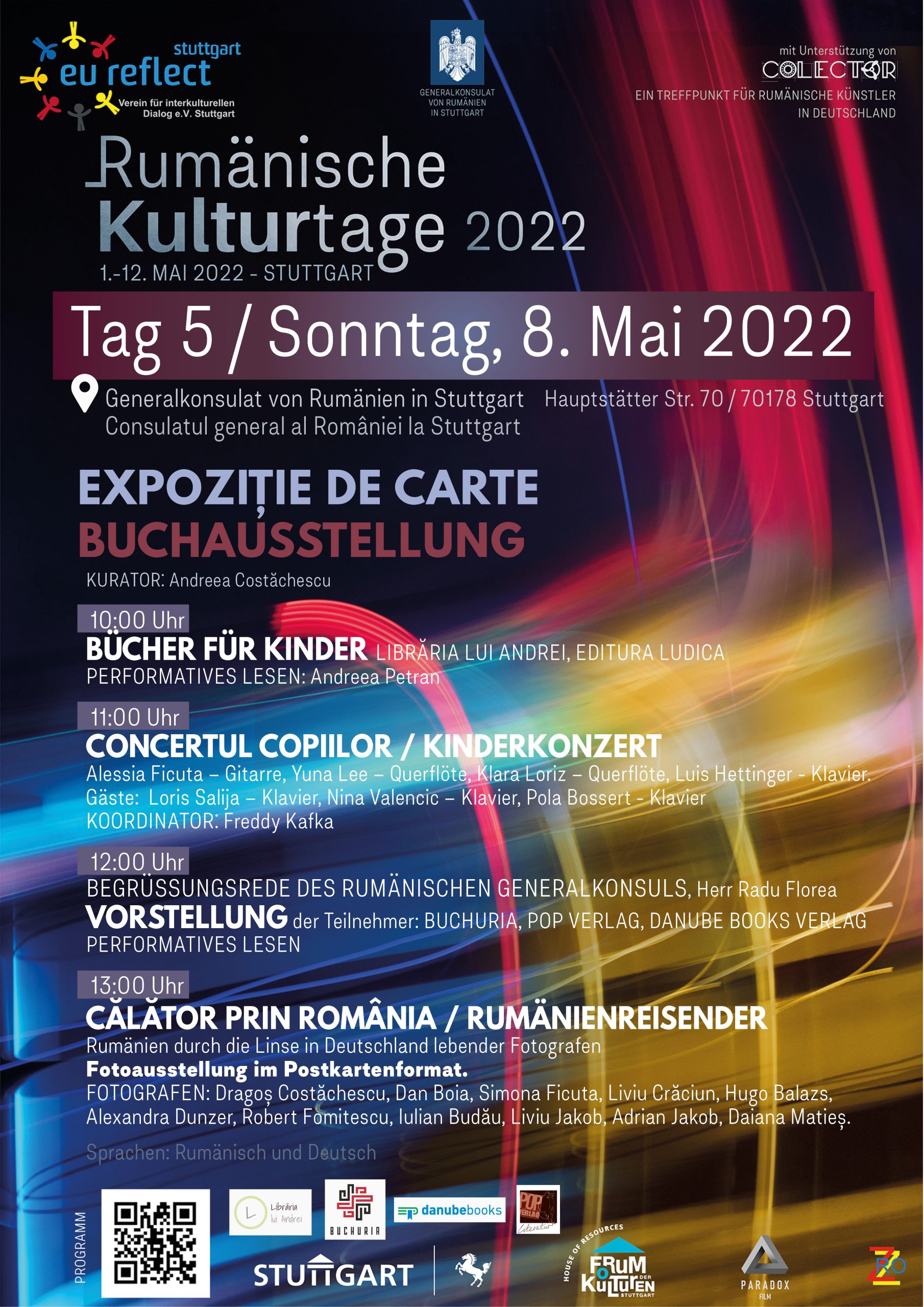 Während der Rumänischen Kulturtage in Stuttgart (1. bis 10. Mai 2022) findet am Sonntag, 8. Mai, im Generalkonsulat von Rumänien eine zweisprachige Buchausstellung statt zum Thema „LITERATURA ROMÂNĂ ÎN GERMANIA / RUMÄNISCHE LITERATUR IN DEUTSCHLAND, von 10 bis 14 Uhr mit Verlagspräsentationen und kurzen Lesungen.
